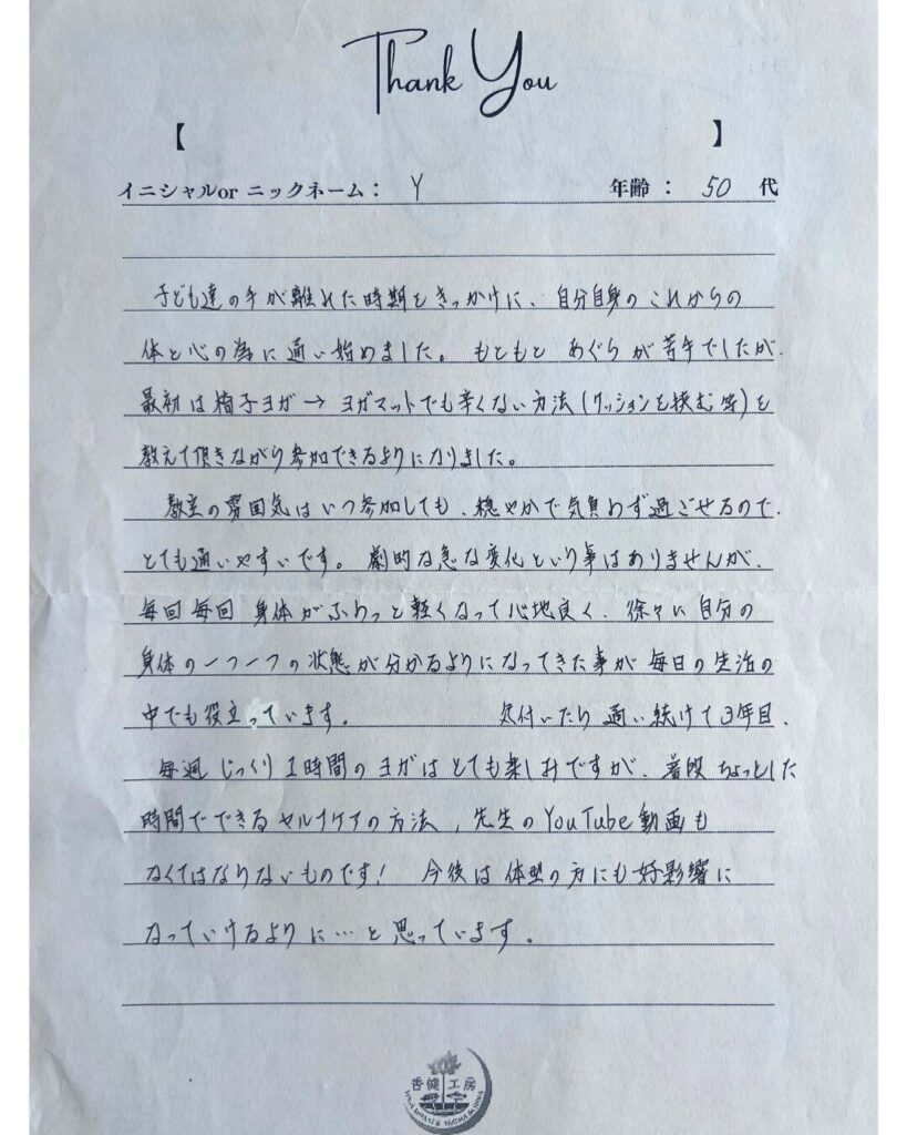 子供達の手が離れた時期をきっかけに、自分自身のこれからの体と心の為に通い始めました。